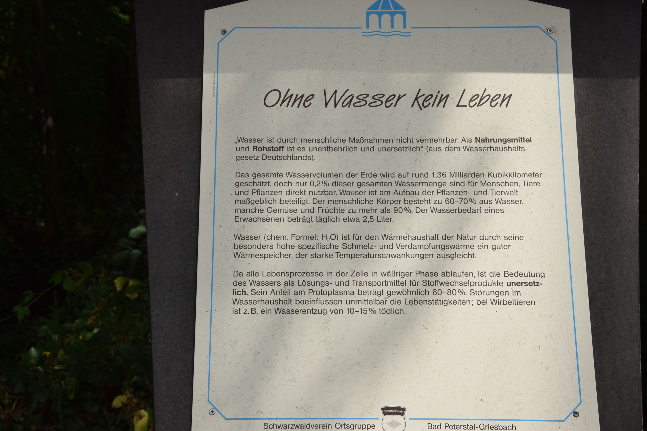 Geparkt wird in der Nähe der Touristeninformation, alternativ am Rathaus, dem Startpunkt des Wasserlehrpfades (externer Link). Der Lehrpfad informiert auf 17 Infotafeln entlang des Weges über die verschiedenen Facetten des Wassers. So z. B. prägt das Vorkommen des natürlichen Mineralwassers die Region (Peterstaler Mineralquellen GmbH). Doch der Pfad möchte auch mahnen, mit dem kostbaren und knappen Wasser verantwortungsvoller umzugehen. Obwohl wir große Mengen Wasser auf der Erde haben, sind nur 0,3% davon als Trinkwasser nutzbar.