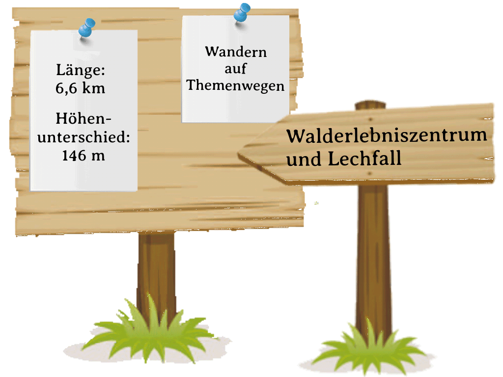 Unsere Wanderung besteht aus dem 1,7 km langen Bergwaldpfad (externer Link), den wir zuerst in Angriff nehmen wollen, und dem 1,5 km Auwaldpfad (externer Link), sowie eine Wanderung zum Lechfall und optional weiter entlang des Pfad der Sinne (etwa 2 km).