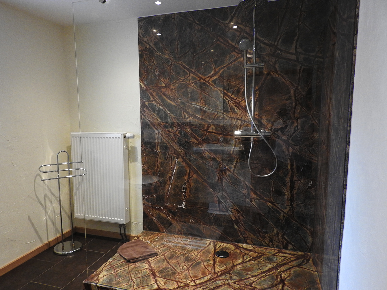 Vom Eingang geht es geradeaus in das Doppelbettzimmer mit Dusche und WC (siehe Bild 9 - Grundriss). Rechts geht es in den Flur der großen Ferienwohnung. Hier gehen das Bad, die beiden Schlafzimmer und der Wohnbereich