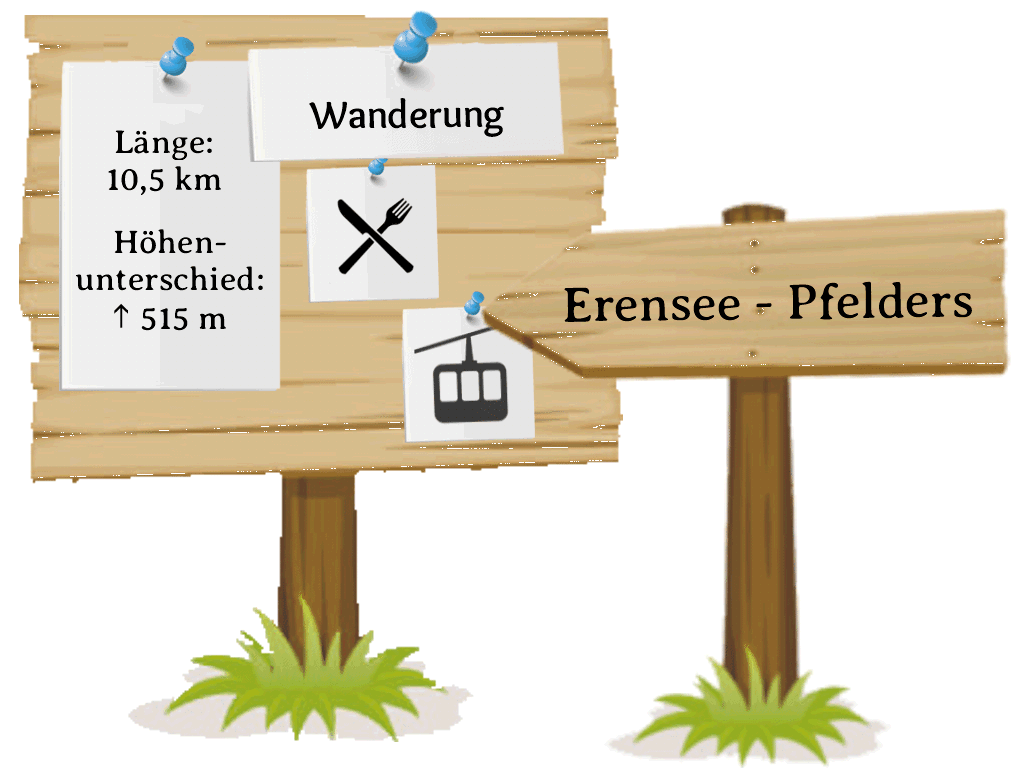 Hier müssen wir eine Entscheidung treffen. Kürzen wir die Wanderung ab und schwenken auf den Wanderweg 4, oder geht es auf dem Wanderweg 7 auf einer Länge von 1,8 km um 416 m in die Höhe? Dieser etwa 3-stündige Abstecher führt uns zum Erensee, einem auf 2.300 m liegenden Gebirgssee. Den gleichen Weg (diesmal bergab) geht es wieder zurück und wir folgen dem Wanderweg 4 ...... der uns hinunter in das Lazinser Tal. Unten angekommen erwartet uns das Gasthaus Lazins (externer Link) (täglich 9.00 Uhr bis 18.00 Uhr geöffnet). Mittlerweile befinden wir uns auf dem Wanderweg 24, der uns zurück nach Pfelders führt.