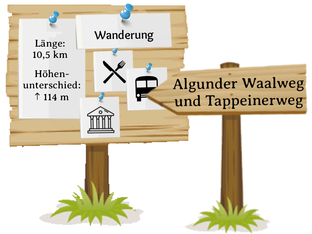 Der Algunder Waalweg erstreckt sich entlang eines historischen Bewässerungskanals, der einst zur Bewässerung der umliegenden Felder genutzt wurde. Der fast ebene Weg führt durch Weinberge und Mischwälder und wird vom Murmeln des Wassers begleitet. Er bietet uns Ausblicke auf Algund und das Meraner Land. Möglichkeit zur Einkehr haben wir bereits nach 1,3 km im Restaurant Leiter am Waal (externer Link) (täglich außer Dienstag von 10.30 Uhr bis 23.00 Uhr). Die nächste Einkehrmöglichkeit ist das Kaffee Konrad (Montag bis Freitag von 10.30 Uhr bis 18.00 Uhr) bei km 2,3 unserer Wanderung.