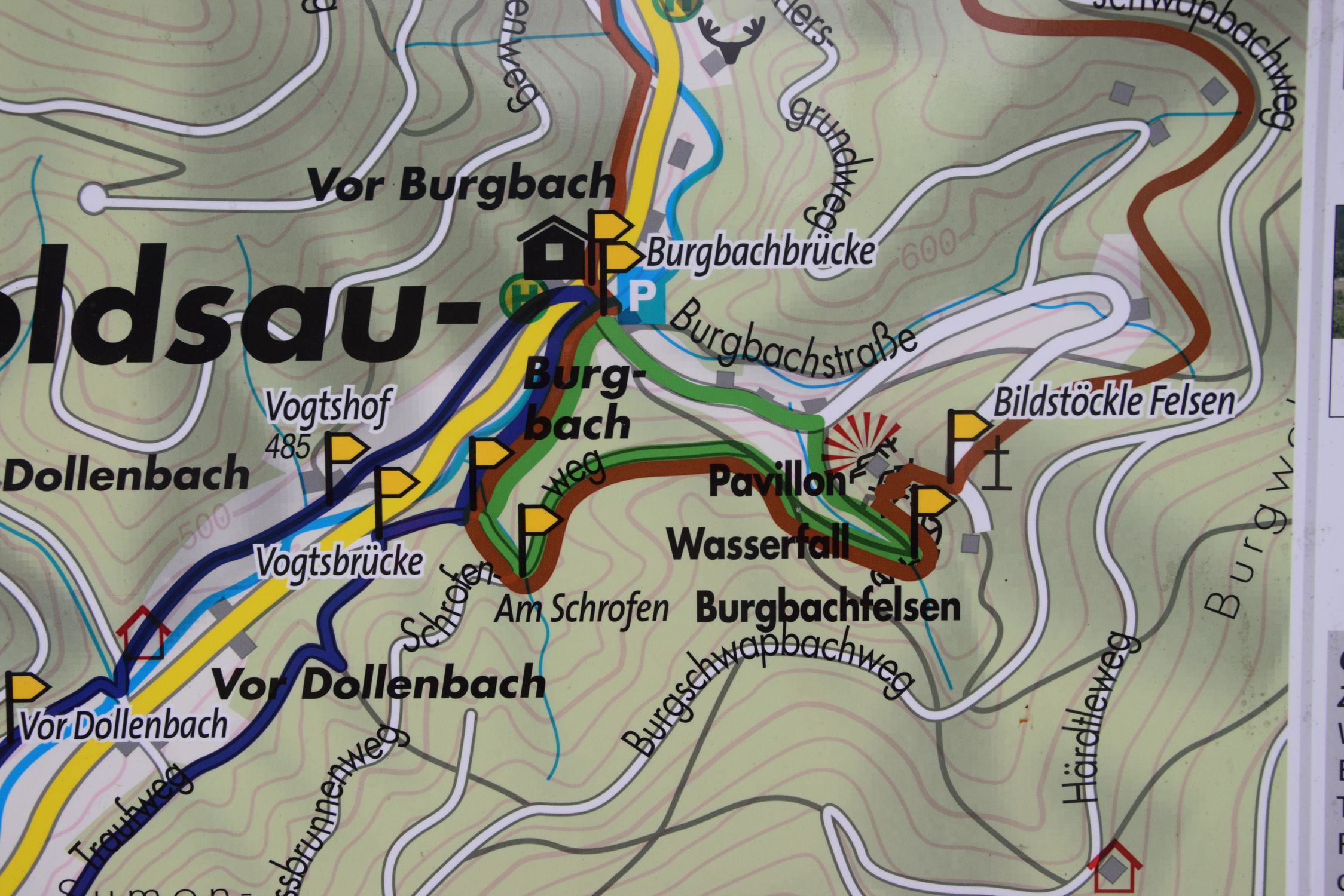 Die Wanderung beginnt am Wanderparkplatz an der Wolftalstraße und führt uns zum Naturdenkmal Burgbachwasserfall.