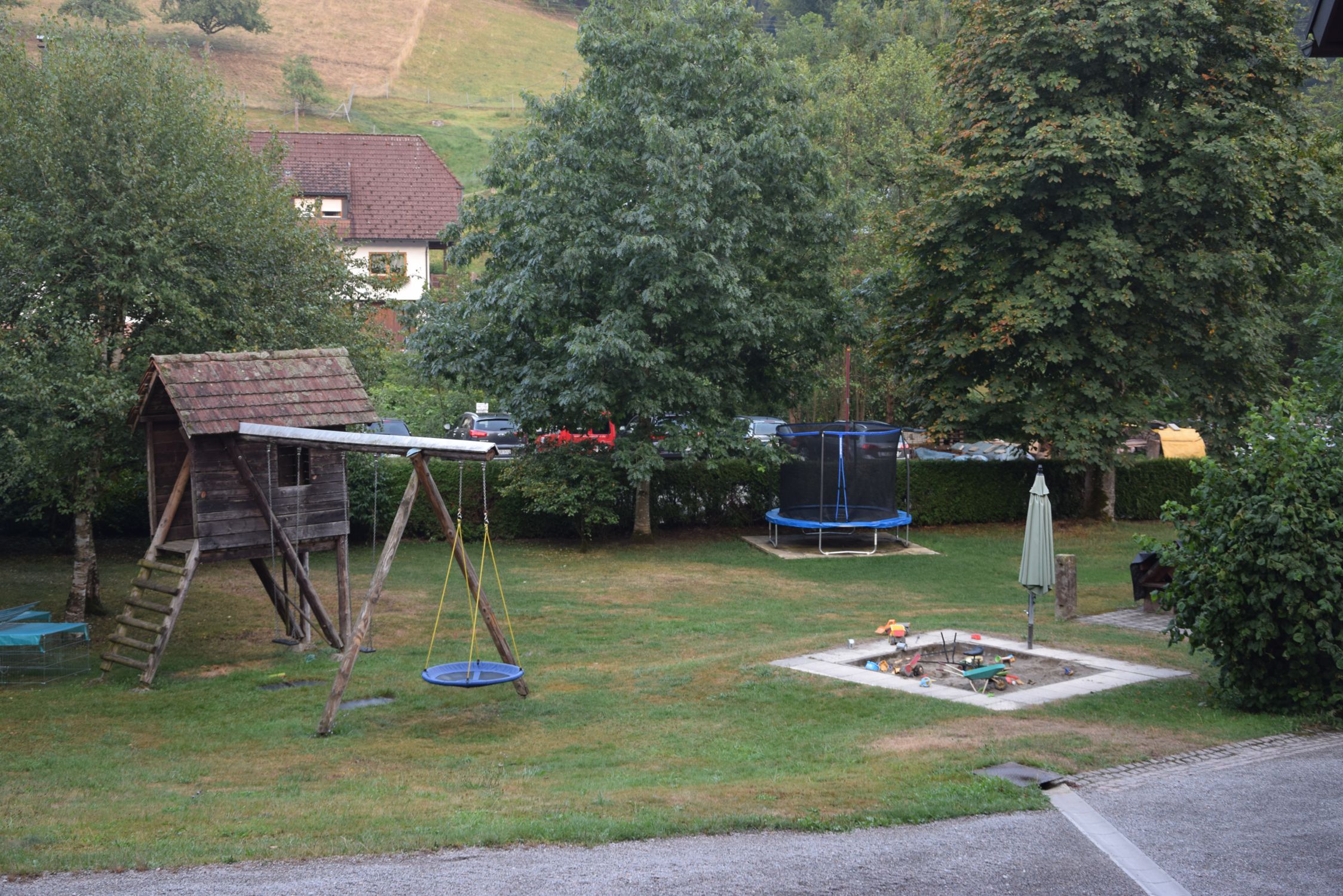 Kinder durch den Spielplatz mit Sandkasten, Schaukel, Hütte und Spielwiese. Außerdem stehen Bobbycar, Kettcar, Tretunimog und Trampolin, sowie Stelzen für einen Stelzenlauf zur Verfügung.