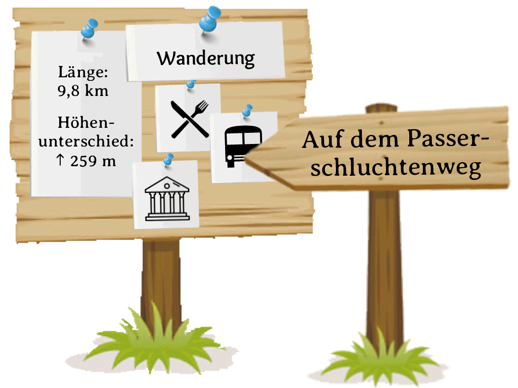 Zunächst folgen wir dem Passerschluchtenweg bis wir die gestaute Passer über eine Brücke überqueren können. Bevor wir aber uns in das Abenteuer "Schluchtenwanderung" begeben, wandern wir den Wanderweg 1A etwa 1km lang, bis wir auf den Stieber Wasserfall stossen. Dort stürzt der Pfelderer Bach in zwei Kaskaden zuerst 19 Meter und dann noch einmal 18 Meter tief in die Schlucht. Das tosende Wasser sorgt durch den feinen Wassernebel für eine erfrischende Abkühlung. Unweit befindet sich noch das ...