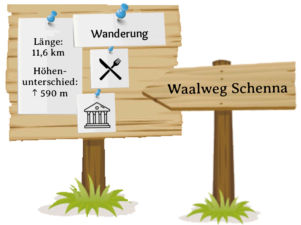 Hier biegen wir links ab und gehen auf der Straße ein Stück nordwärts bis wir auf den Wiesenweg treffen, den wir etwa 1,5 km lang folgen, bis wir auf die St. Georgskirche. Sie stammt aus dem 12./13. Jahrhundert und war ursprünglich die Kapelle der Burg St. Georgen. Die Fresken im Inneren sind aus dem 14. Jahrhundert und zeigen unter anderem das Martyrium des heiligen Georg, das Jüngste Gericht und die St.-Nikolaus-Legende. Hier treffen wir auf den Zugangsweg zum Schenna-Waalweg. Wir wandern auf diesem nun etwa 2,5 km nordwärts bis wir am Hotel-Restaurant Pichler (externer Link) ankommen. Die Küche des Restaurants ist täglich außer dienstags zwischen 11.30 Uhr bis 14.30 Uhr und von 17.00 Uhr bis 20.45 Uhr für uns geöffnet. Falls wir es bis dorthin jedoch nicht durchhalten, finden wir vorher am Waalweg die Jausenstation Café am Waal (externer Link). Hier werden von Sonntag bis Freitag, jeweils von 09.00 Uhr bis 18.00 Uhrn die weniger gehobenen Ansprüche der Wanderer erfüllt.