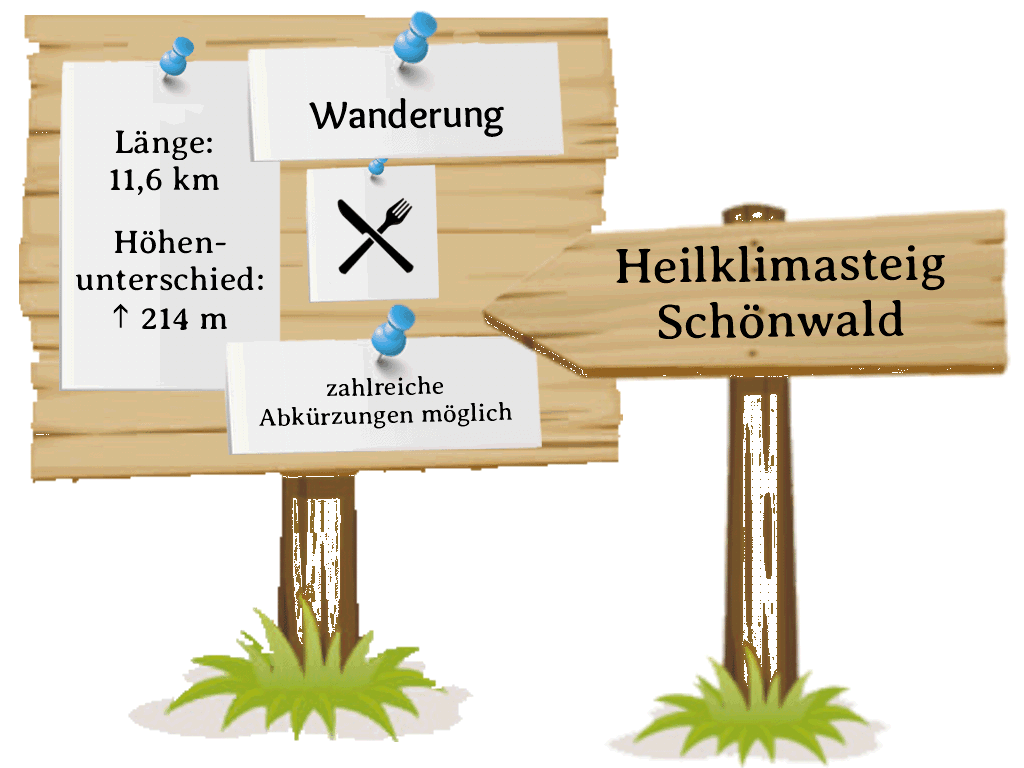 Auf dem Weg zur Katharinenhöhe habne wir bei km 3,4 der Wanderung die Möglichkeit abzukürzen, in dem wir direkt zur Klinik wandern. Weiter geht es zur "Bei der Escheck", wobei wir die zwei Panoramapunkte "Himmelswiese" und "Panoramablick" passieren, von denen wir jeweils tolle Blicke auf den Ort Schönwald werfen können. Die Löwenpatisserie (externer Link) lädt zu einer Kaffee-Pause ein.